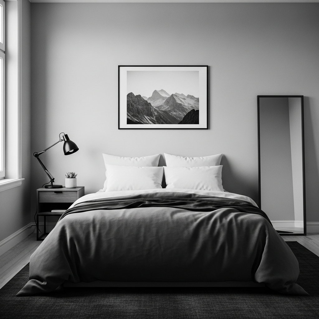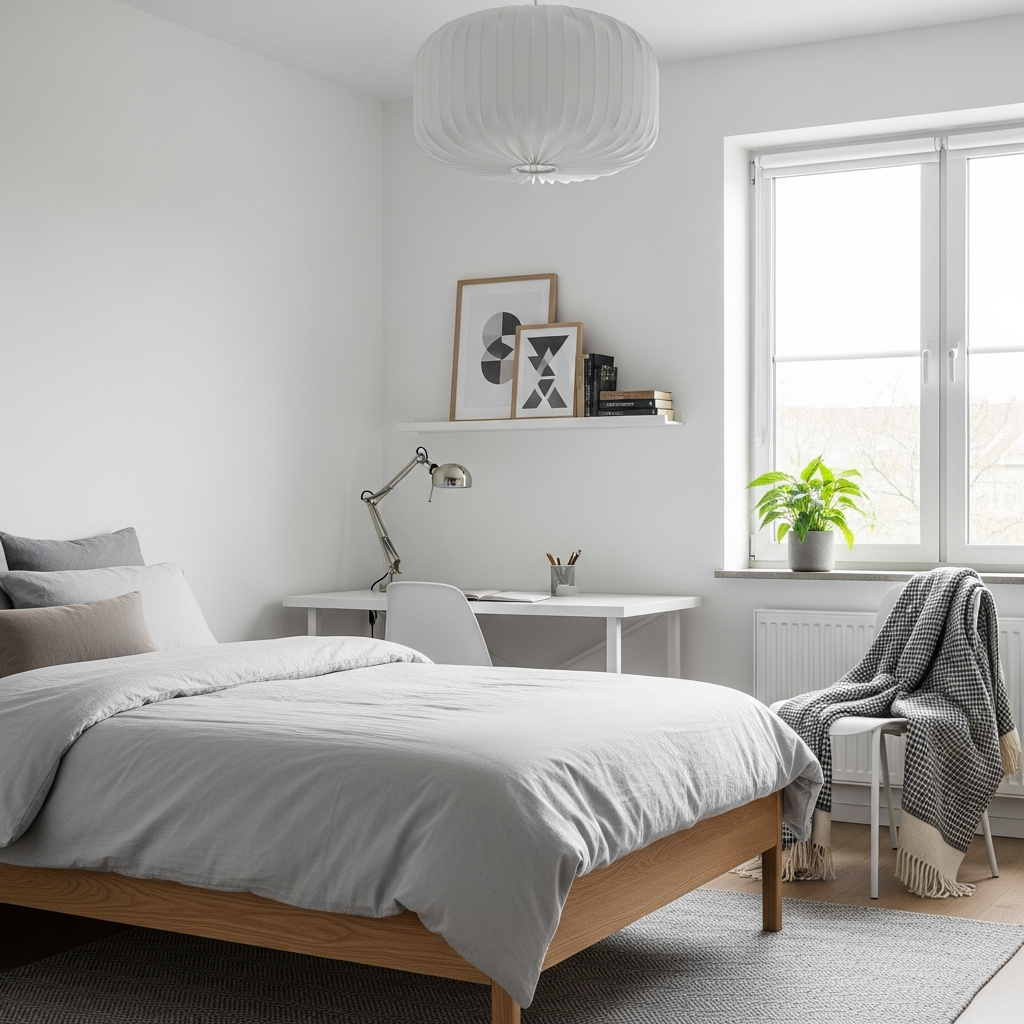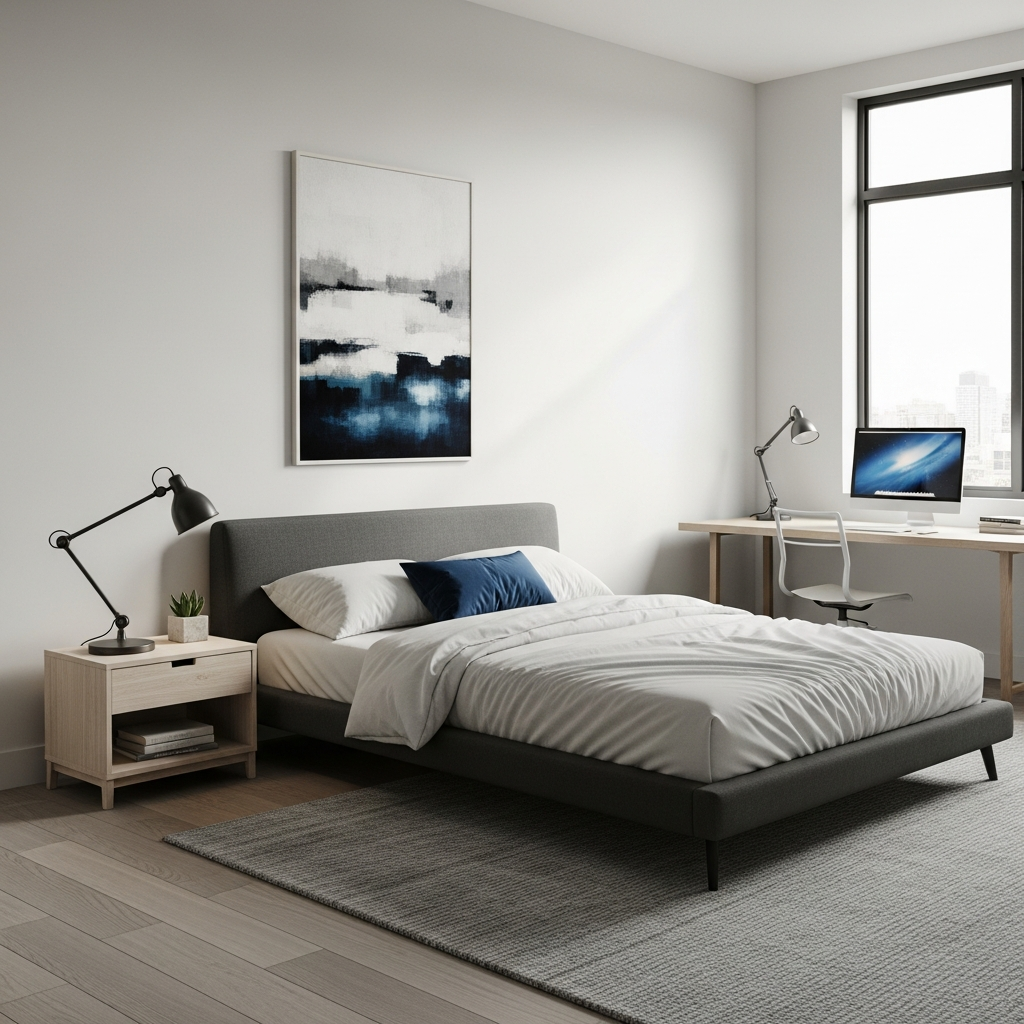 Embrace clean lines and a clutter-free environment with a modern minimalist approach. The color palette centers on shades of grey, crisp white, and deep charcoal, with natural wood accents. Furniture features simple silhouettes, like a platform bed with integrated storage and a sleek desk. The mood is calm and sophisticated, promoting focus and relaxation.