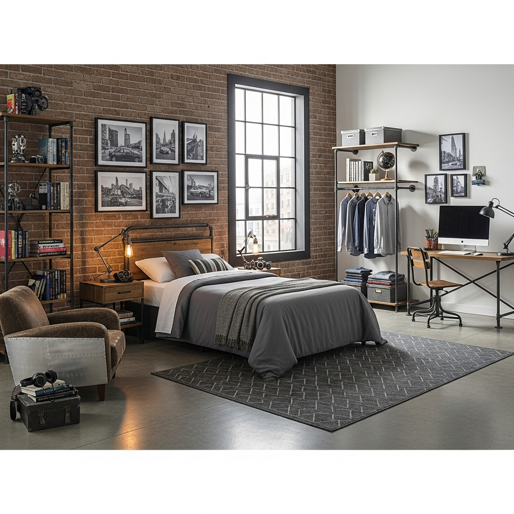 Bring the raw, edgy appeal of an urban loft into the bedroom. Exposed brick wallpaper or concrete-effect walls set the scene. Think dark metals, rich brown leather, and reclaimed wood for furniture. A metal-framed bed and industrial-style shelving create a rugged, yet stylish atmosphere, perfect for a strong personality.