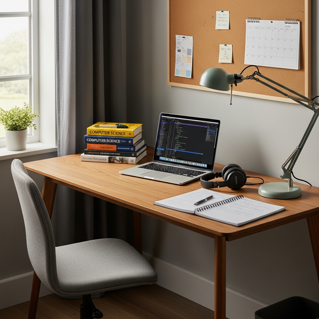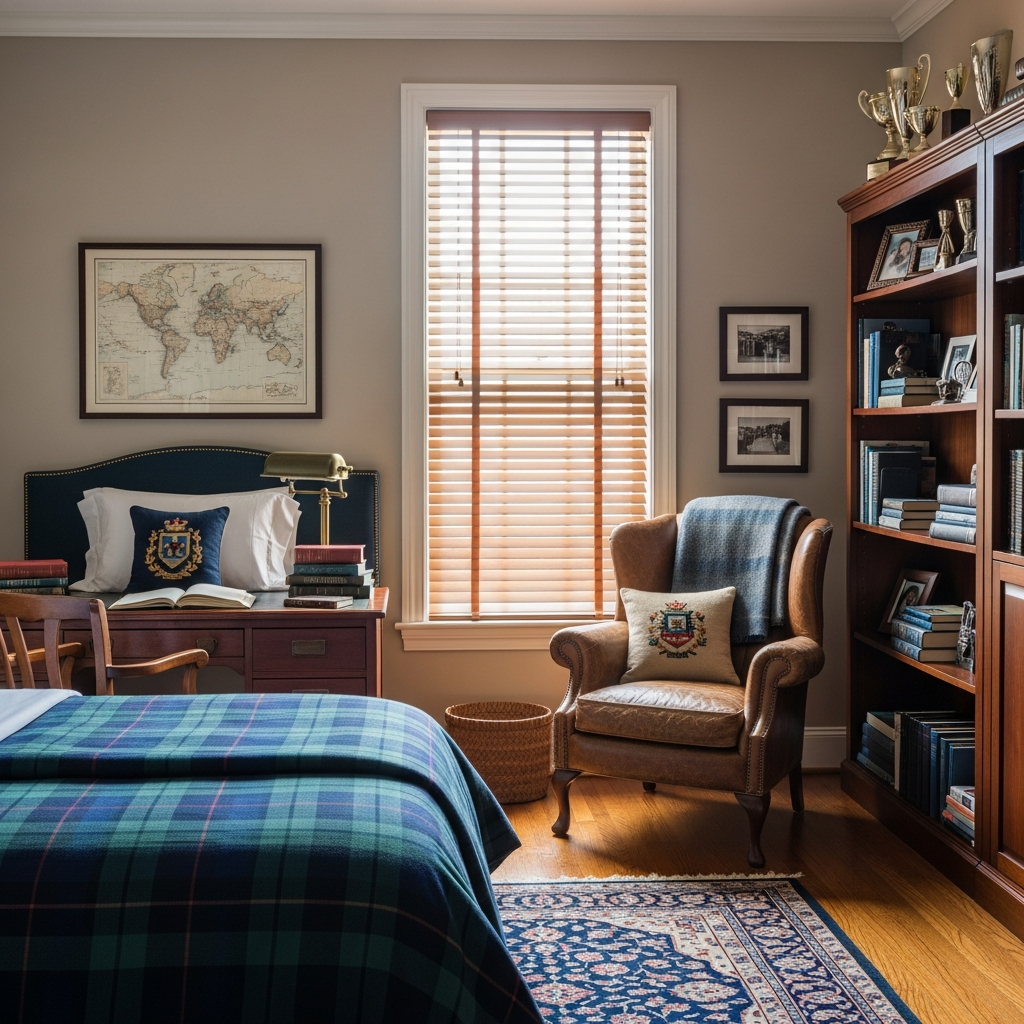 Infuse the room with timeless elegance and academic charm. A rich color palette of navy blue, forest green, burgundy, and warm creams sets the tone. Classic wood furniture, plaid textiles, and framed prints create a sophisticated, tailored look. It’s a refined space for study and relaxation.