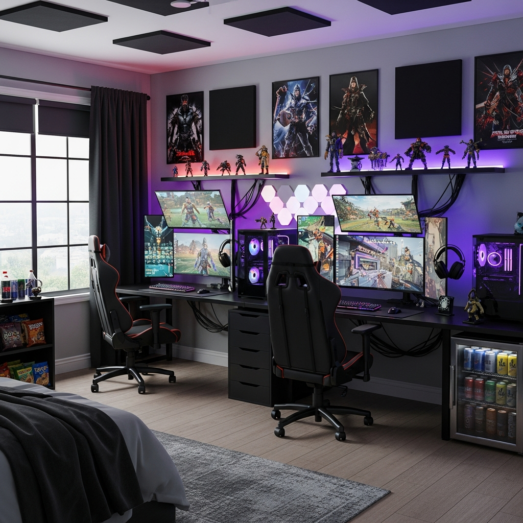 Design a room that caters to his gaming passion with both comfort and technology in mind. A dark, immersive color palette of charcoal, black, and electric blue provides a cool backdrop. Invest in an ergonomic gaming chair, a spacious desk for multiple monitors, and strategic LED strip lighting. The mood is high-tech and focused.