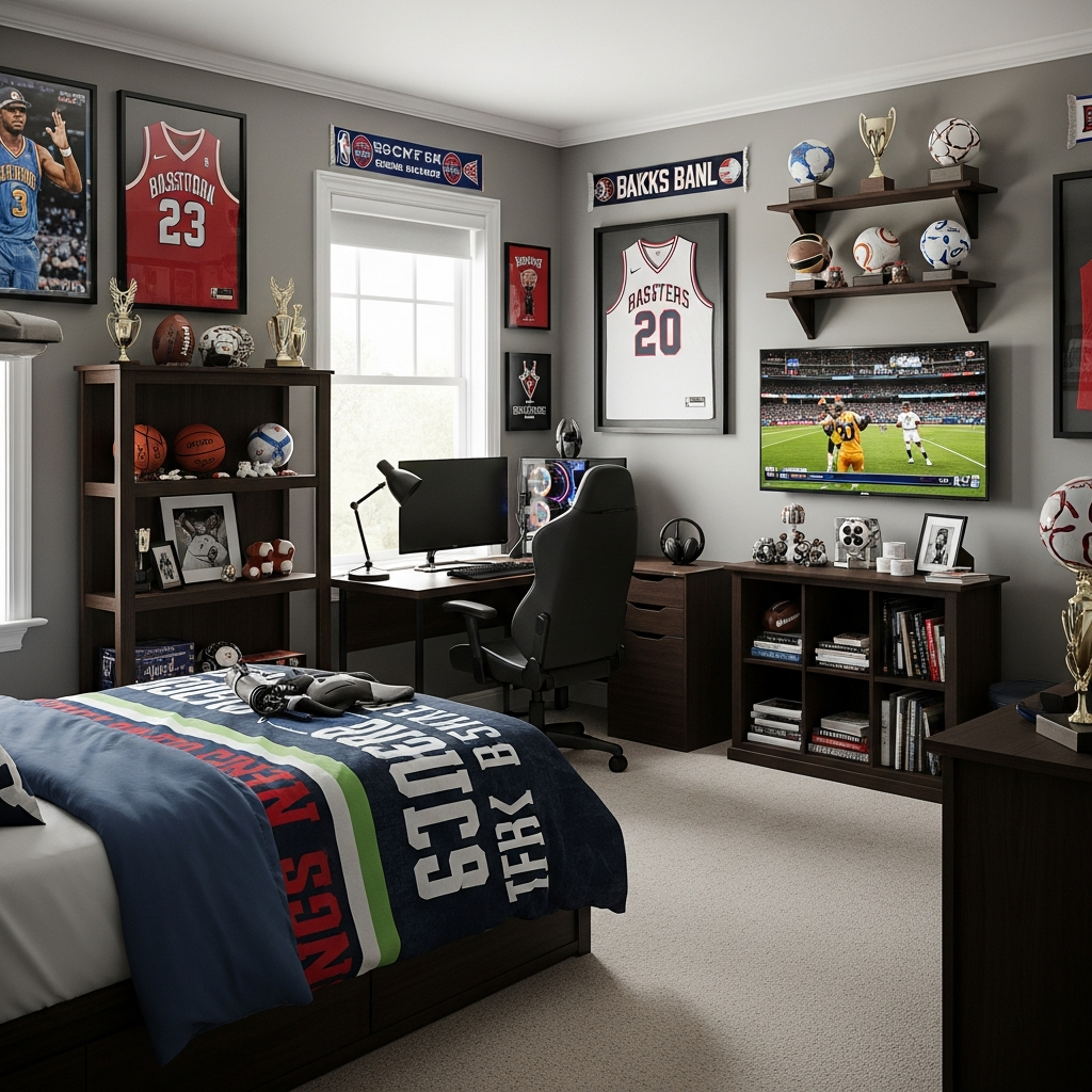 Celebrate his passion with a dedicated sports theme that feels refined, not childish. Choose a sophisticated color scheme, perhaps deep navy, rich forest green, or a classic black and white. Display memorabilia tastefully in shadow boxes or on sleek floating shelves. A comfortable recliner or beanbag adds to the game-day comfort.