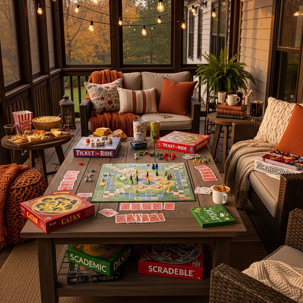 Equip your porch for friendly competition and lively evenings. A comfortable grouping of chairs around a sturdy game table is ideal. Consider a small console for storing board games, playing cards, or even a dartboard.