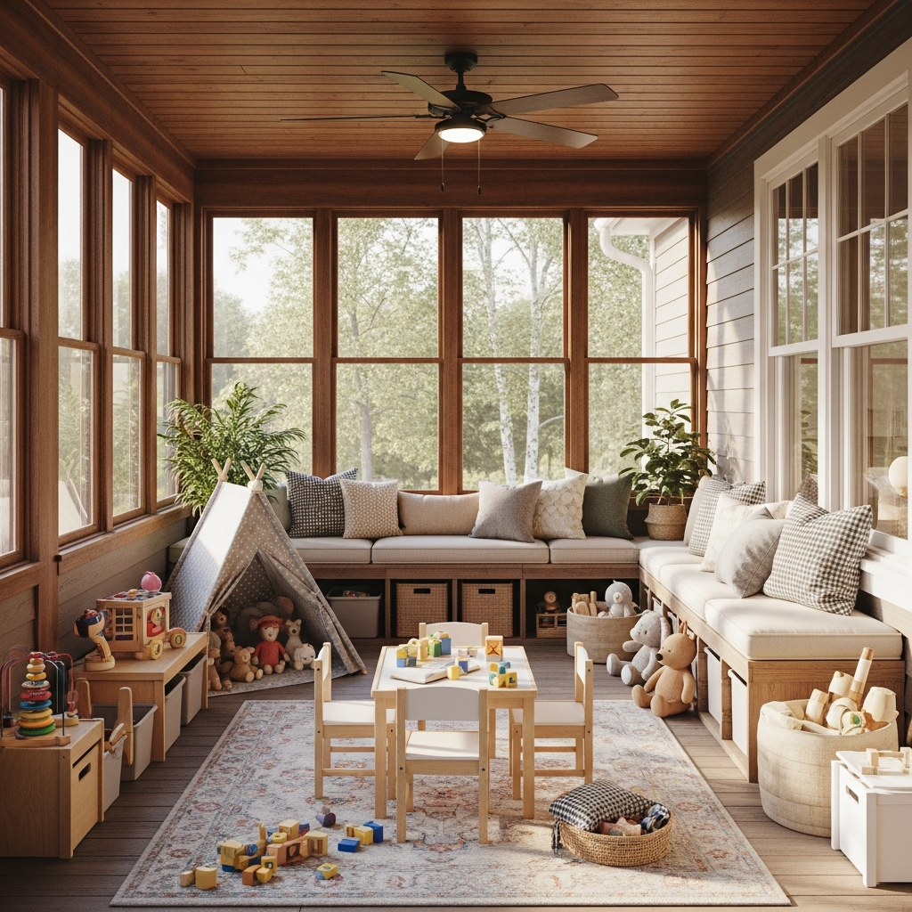 Bright and cheerful colors are welcome here, alongside sturdy materials that can withstand energetic play. Ensure furniture has rounded edges for safety. This idea provides a designated spot for imaginative play without taking over the whole house.