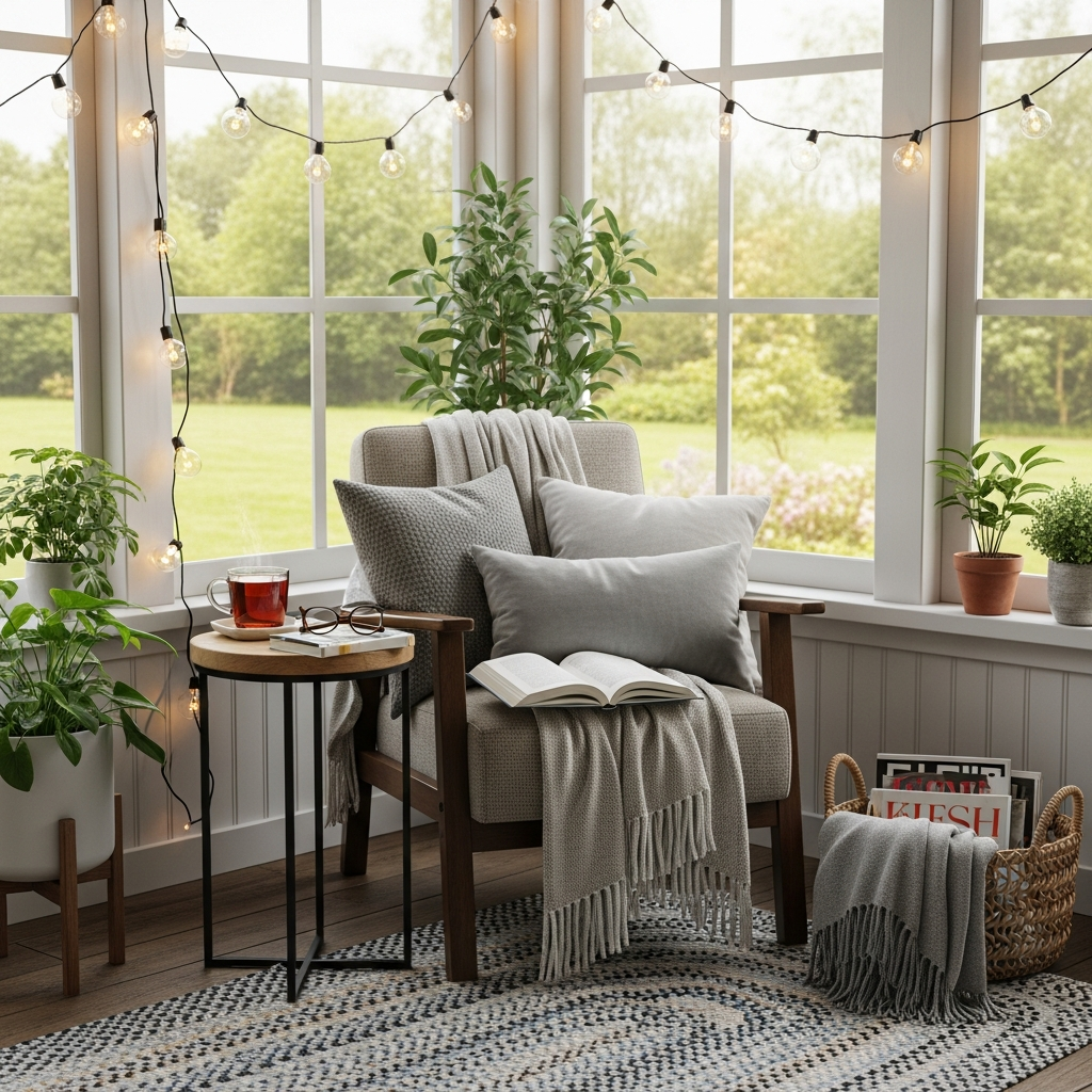 Dedicate a section of your porch to literary escape. A deep, comfortable armchair or a chaise lounge is essential, paired with a small side table and a task lamp. Add a soft throw blanket and an ottoman for ultimate comfort.
