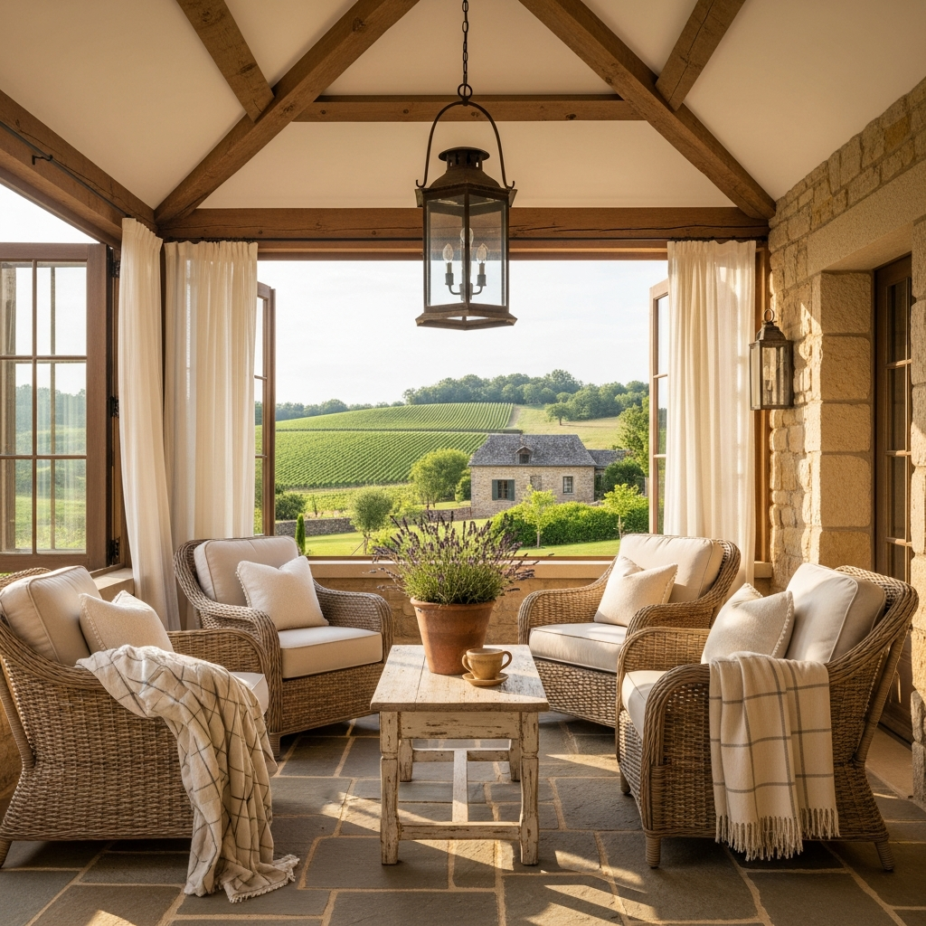Infuse your porch with the rustic elegance of Provence. Look for distressed wooden furniture, perhaps a small console table or a charming bench. Use fabrics with classic toile patterns or simple checks in muted colors.