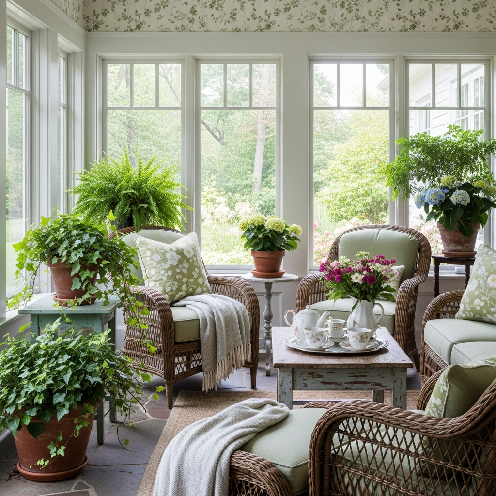 Integrate elements like large potted ferns and flowering hydrangeas to bring the garden indoors. Materials include classic wicker, durable cotton fabrics, and dark wood accents. The atmosphere is elegant, airy, and steeped in timeless comfort.