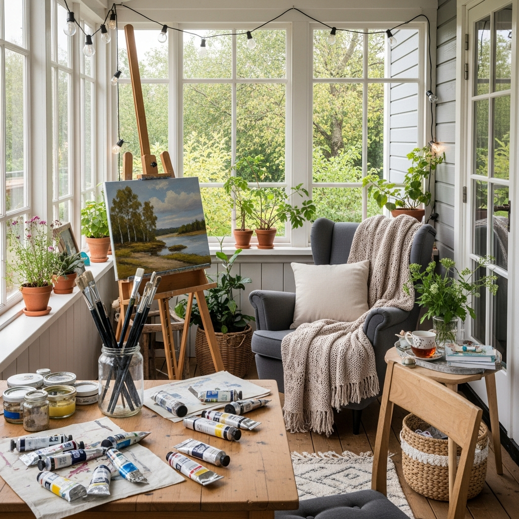 Harness the natural light and inspiring views of your porch to create an art studio. An easel, a sturdy table for supplies, and perhaps a comfortable stool are central. Good natural light is the main feature, complemented by adjustable task lighting.