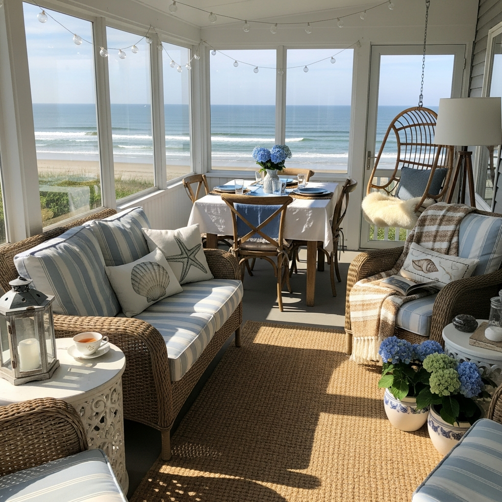 Accessorize with natural elements like decorative shells, glass buoys, and rope accents. Textiles include cotton and linen for a breathable feel. The overall mood is light, breezy, and effortlessly refreshing, like a day at the beach.