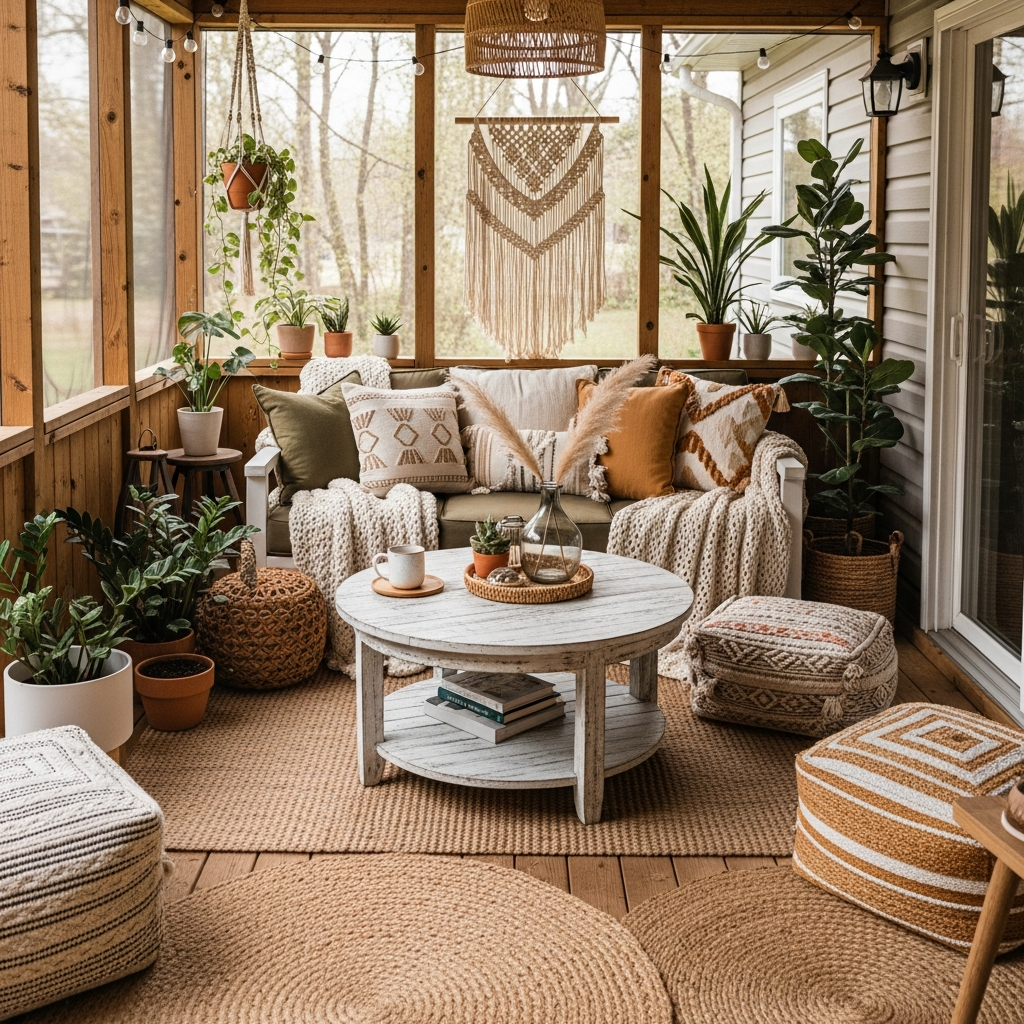 Embrace a relaxed, free-spirited vibe with natural textures and earthy tones. Think rattan furniture, a woven jute rug, and layers of macrame hangings. Introduce floor cushions in various patterns and a comfortable daybed draped with a linen throw.