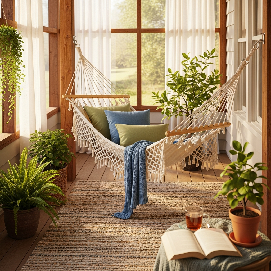 Install a comfortable hammock as the centerpiece of relaxation. Drape it with soft blankets and add a few throw pillows. A small side table for a book and a drink is a practical addition.