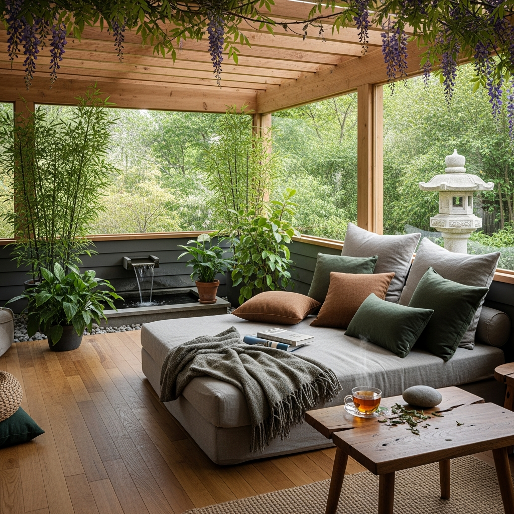 The color palette focuses on muted, natural tones: soft greens, grays, and warm browns. Materials include bamboo, natural stone, and smooth wood. The atmosphere is deeply peaceful, encouraging mindfulness and quiet relaxation.