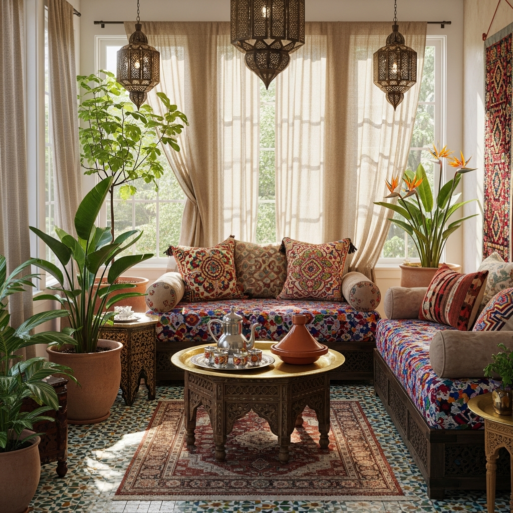 A palette of jewel tones like deep blues, emerald greens, and ruby reds, paired with gold accents, defines this style. Materials include carved wood, hammered metals, and patterned textiles. The ambiance is warm, mysterious, and utterly captivating.