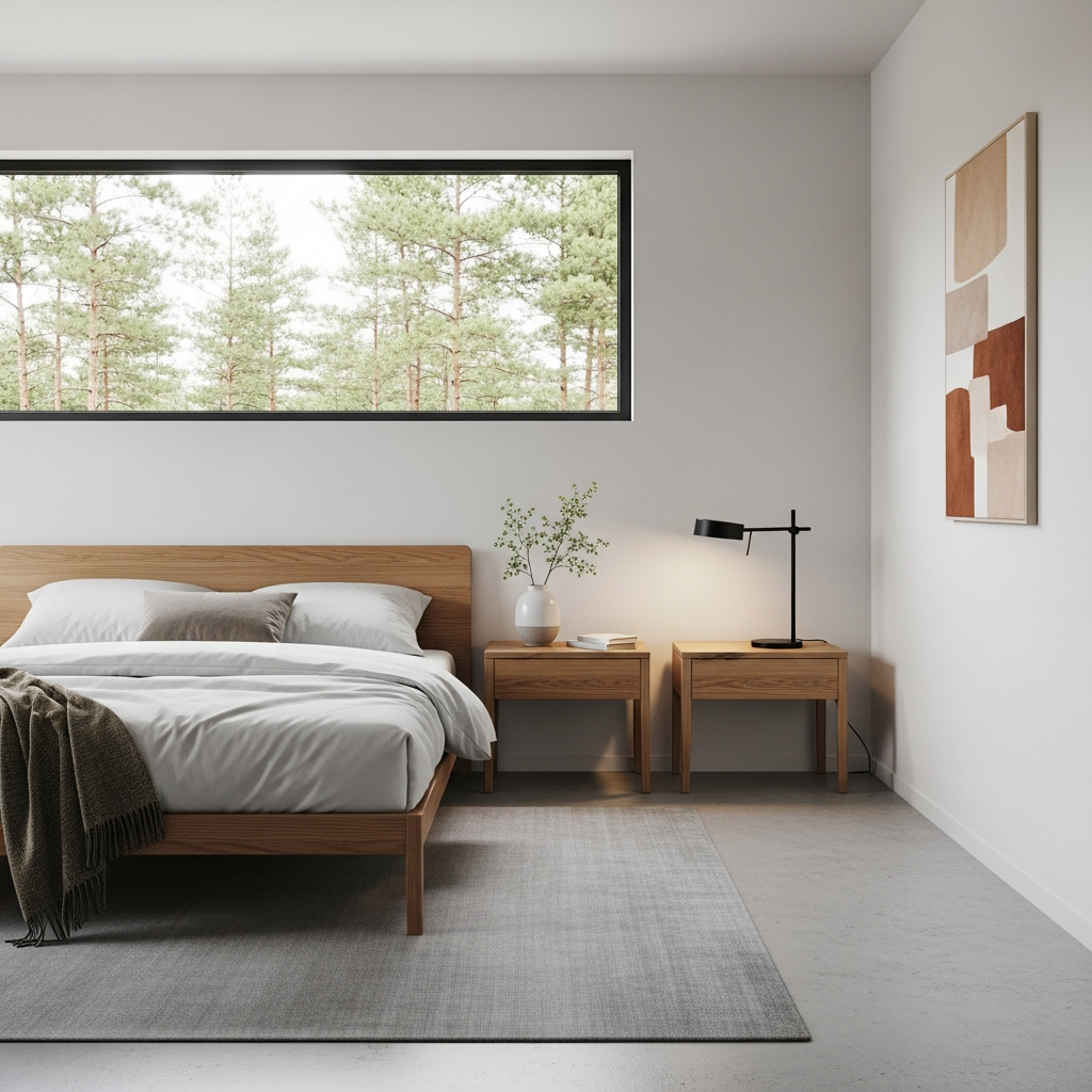 * Minimalist nightstands, often integrated into the bed frame or simple floating shelves.