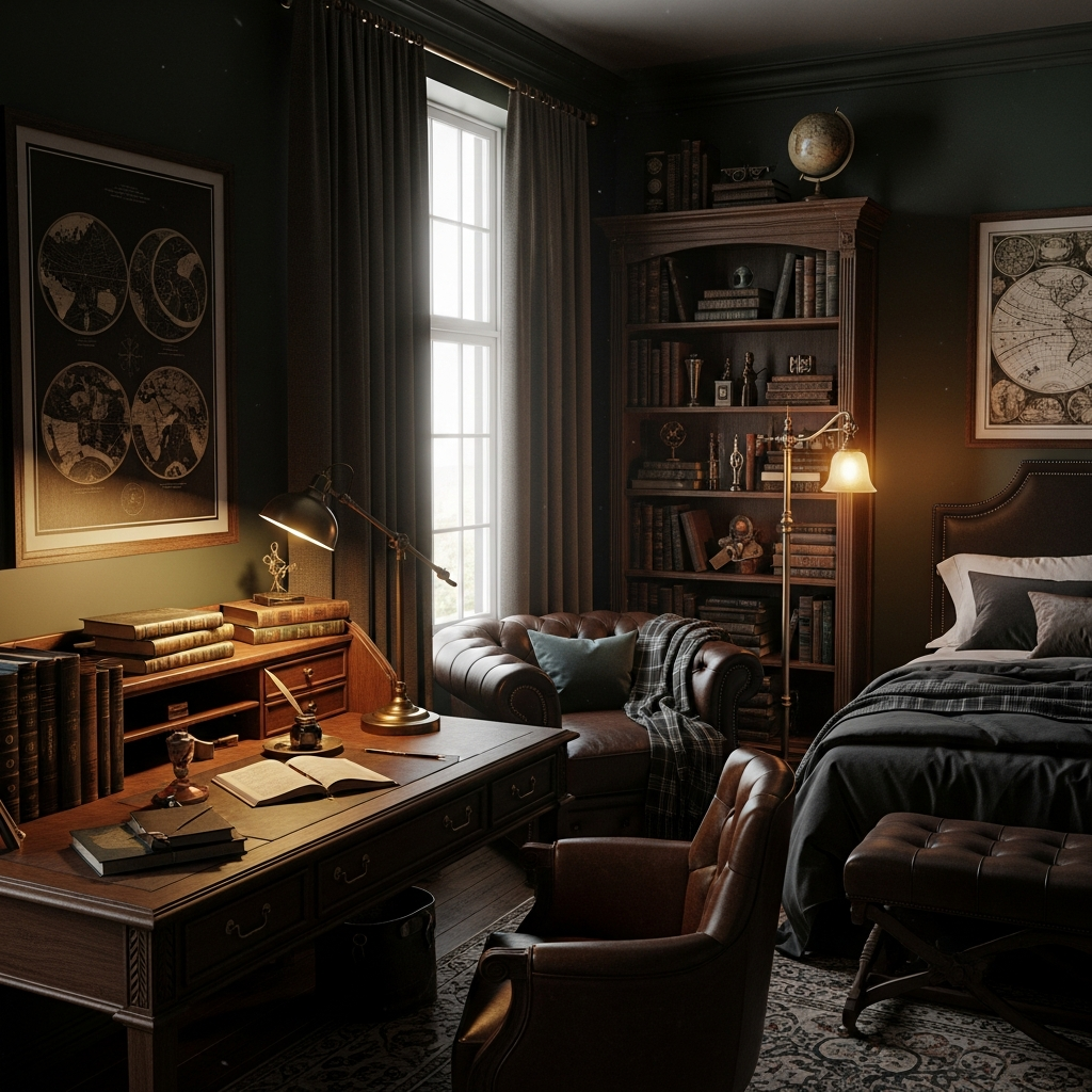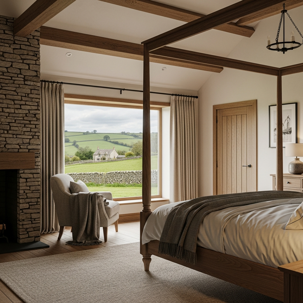 Step into a cozy, charming bedroom inspired by classic English country homes. This design emphasizes comfort, floral patterns, and antique elegance.