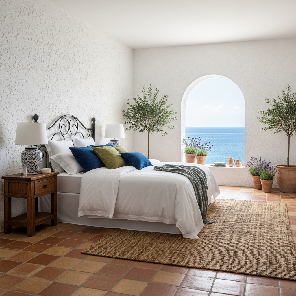 * Linen bedding, wool throws, and cotton rugs add tactile comfort.