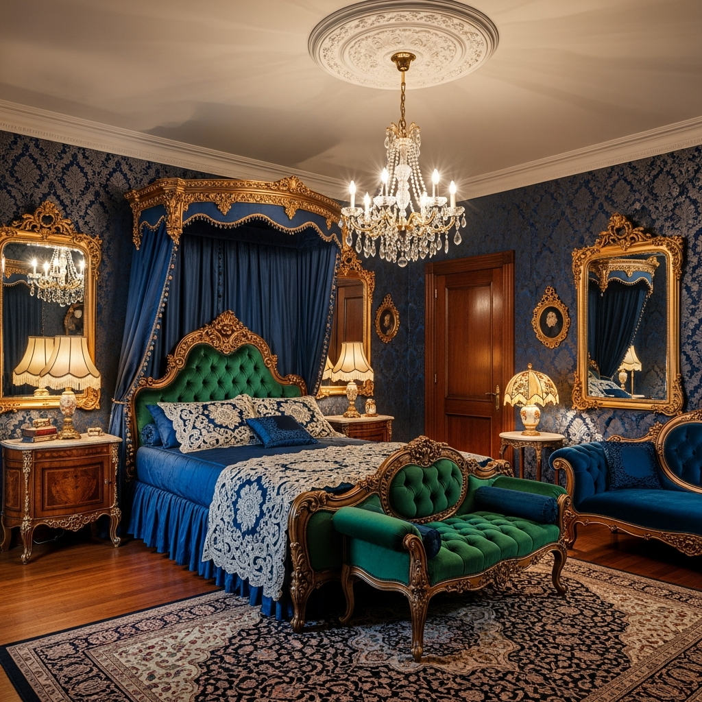 * Large, elaborate bed frames, often with high, tufted headboards or canopies.