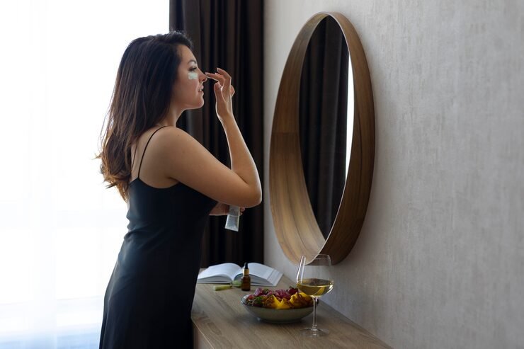 A stylish mirror reflects light, makes the room feel bigger, and adds a fancy touch like wall art.