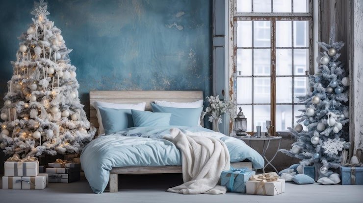 Create a winter wonderland atmosphere in your bedroom by incorporating a color palette of blues, silvers, and whites. These calming colors can help you relax and unwind, and can be paired with festive accents like glitter, sequins, or metallic finishes.
