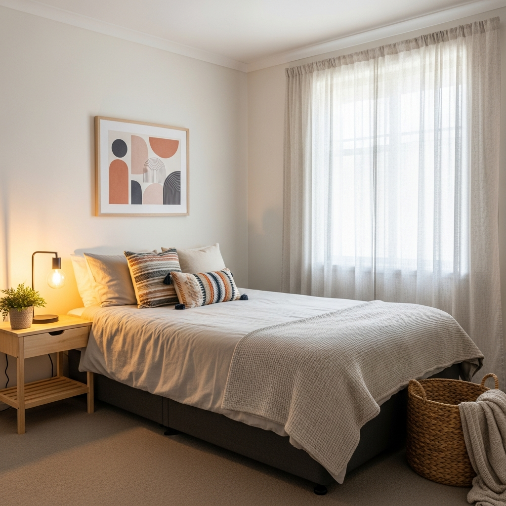 Simple, ready-made curtains can dramatically soften a room and provide privacy. Opt for floor-length panels in a light, airy fabric like linen or cotton, hung high and wide to make windows appear larger. Sheer options allow natural light to filter through gently.