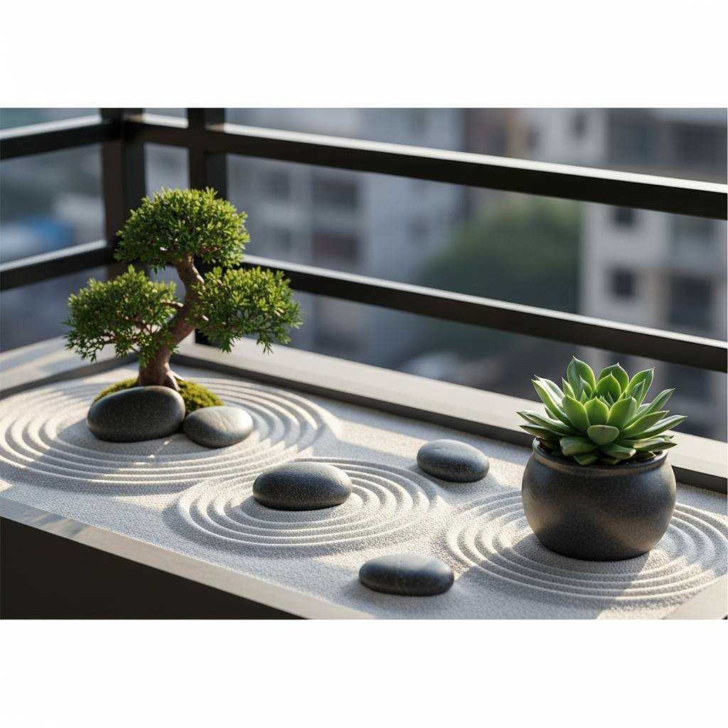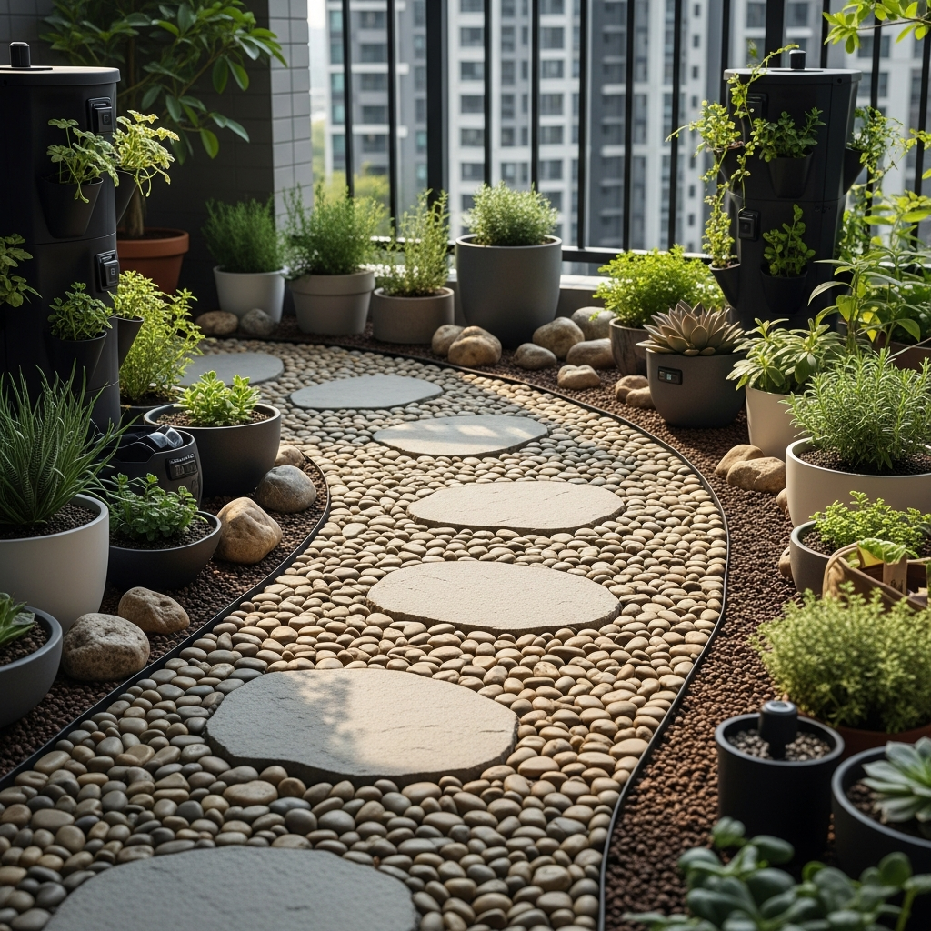 Even on a small balcony, you can define areas with a simple pebble or stone pathway. A section of smooth river stones can delineate a walking path or highlight a seating area. This adds a tactile and visual element.