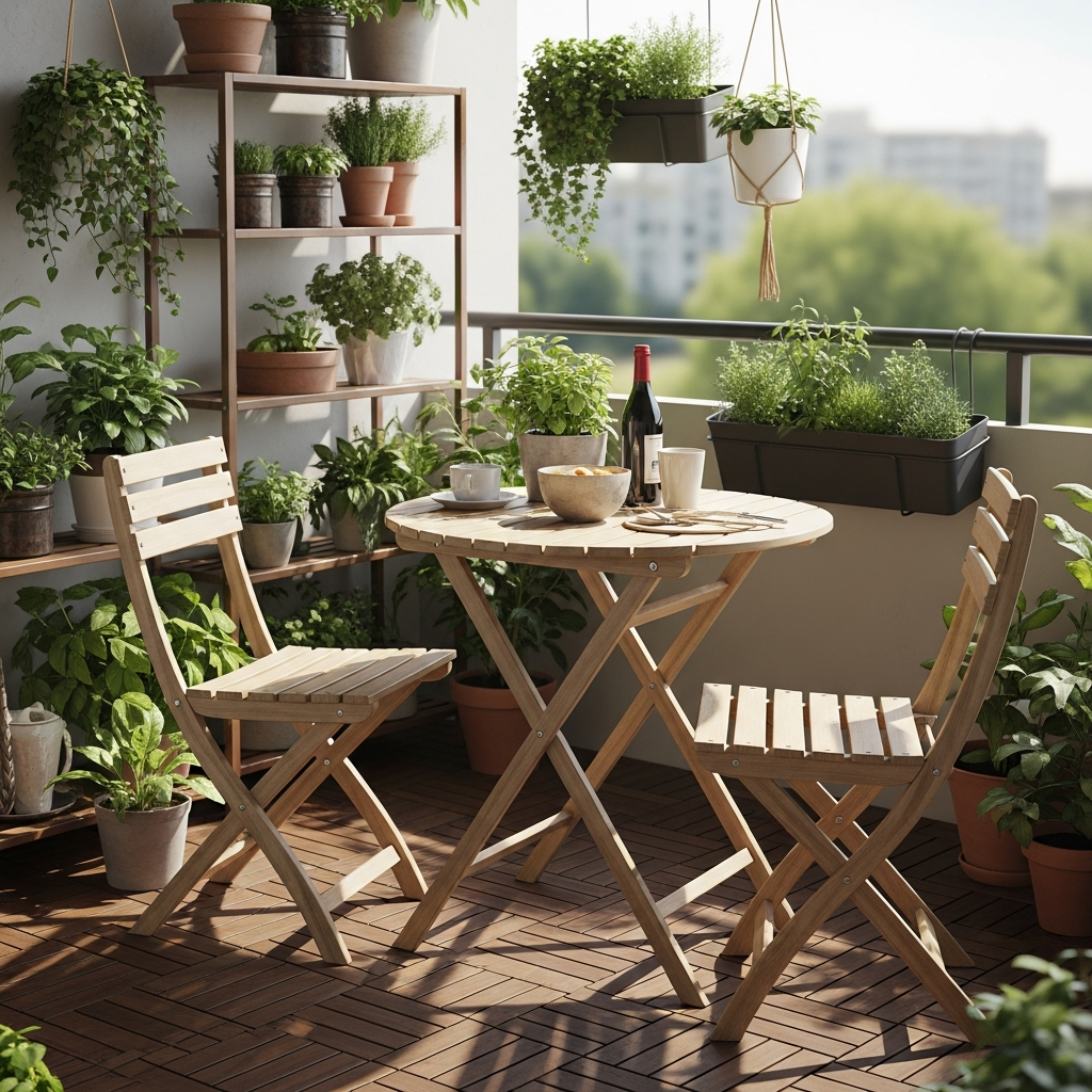 Optimize your balcony for intimate meals with a foldable bistro set. Choose chairs and a table that can be tucked away when not in use, leaving more floor space. Materials like wrought iron or light aluminum in charcoal gray or forest green lend a classic touch.