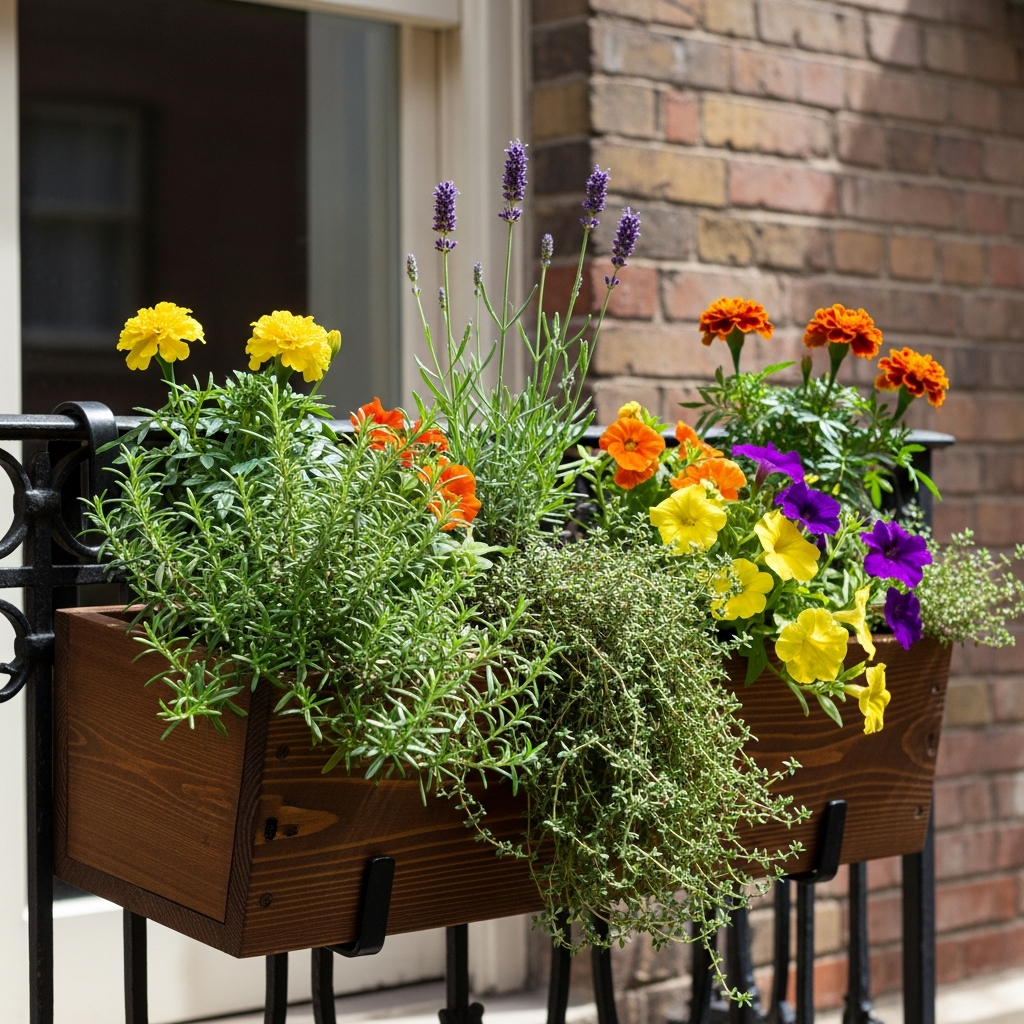 If railing space allows, a long window box filled with a mix of herbs and colorful flowers can be incredibly charming. Choose annuals that provide continuous bloom, like petunias or impatiens, alongside fragrant herbs.