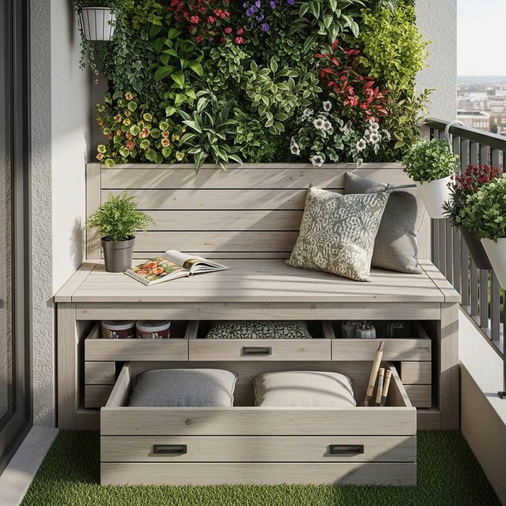 Maximize seating and hide clutter with a custom-built bench that doubles as storage. Beneath the seat, you can stash gardening tools, extra cushions, or small pots. Paint the bench in a soothing sage green or a crisp white.
