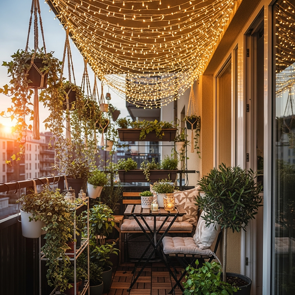 Elevate the evening ambiance with a canopy of string lights. Drape warm white fairy lights across the top or along the railings of your balcony. Pair this with a low, comfortable floor cushion and a small side table.