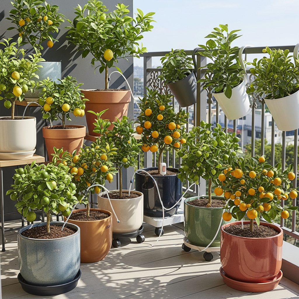 Large, sturdy terracotta or glazed ceramic pots in warm tones complement the glossy green leaves and bright fruit. The mood is sunny, Mediterranean-inspired, and wonderfully refreshing.