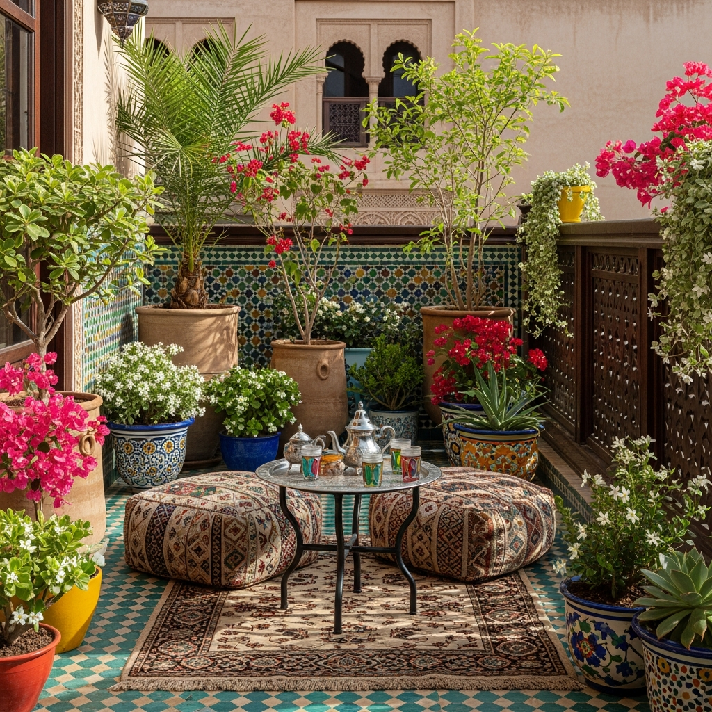 Infuse your balcony with vibrant hues and intricate patterns. Think mosaic tables, jewel-toned cushions, and lanterns casting patterned light. Use glazed ceramic pots in cobalt blue, emerald green, and fuchsia for plants.