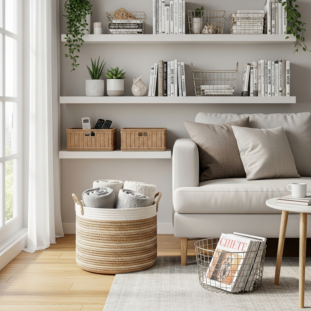 Clutter can quickly make an apartment feel cramped and chaotic. Stylish storage solutions, like decorative baskets, are both practical and visually appealing.