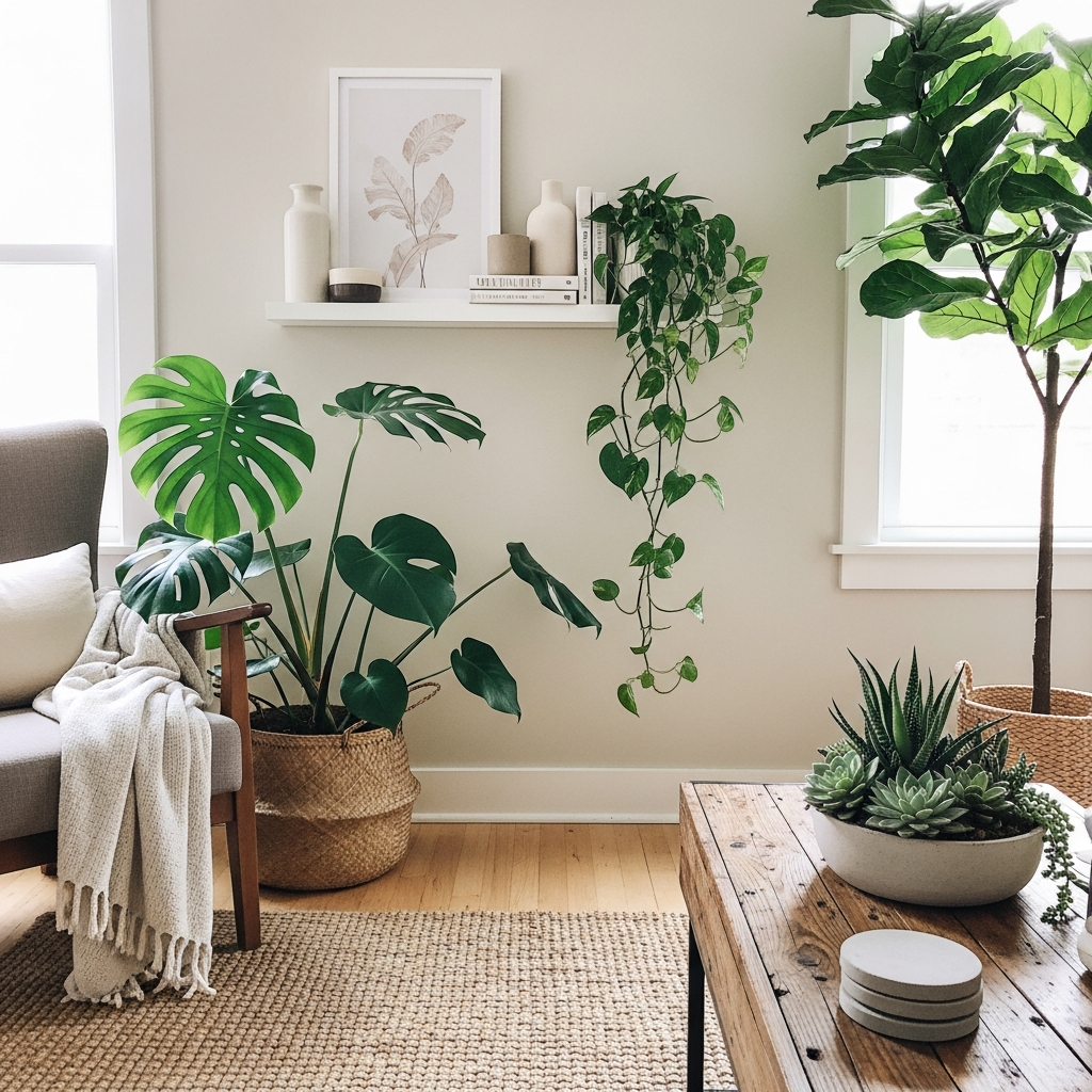 Choose a variety of plants suited for apartment life, such as snake plants, ZZ plants, or Pothos, which are relatively easy to care for. Place them in stylish ceramic pots or hanging planters to add vertical interest. A large fiddle leaf fig can make a bold statement in a living room corner, while smaller succulents can adorn shelves and windowsills.