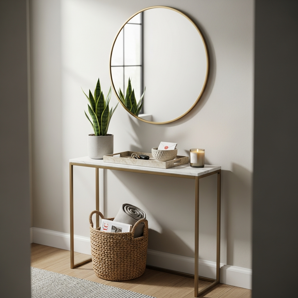 Place a small console table or a floating shelf by the door. Add a small mirror, a key dish, and a plant. A stylish doormat and perhaps a small bench for putting on shoes can make a big difference. Keep it simple and uncluttered to allow for easy entry and exit.