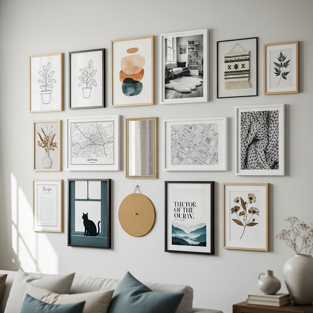 Mix different frame sizes, styles, and finishes, like black, white, and natural wood, for an eclectic yet cohesive feel. Play with both photographs and abstract prints, creating a visual rhythm. Lay out your arrangement on the floor first to get the spacing just right before hanging.