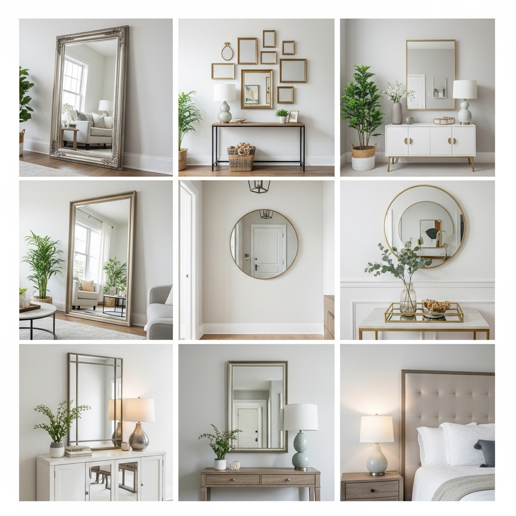 Hang a large mirror on an empty wall to create the illusion of depth. A round mirror above a console table adds softness, while a full-length mirror leaning against a wall can make a bedroom feel larger. Choose frames in brass, gold, or a simple wood to complement your decor style.