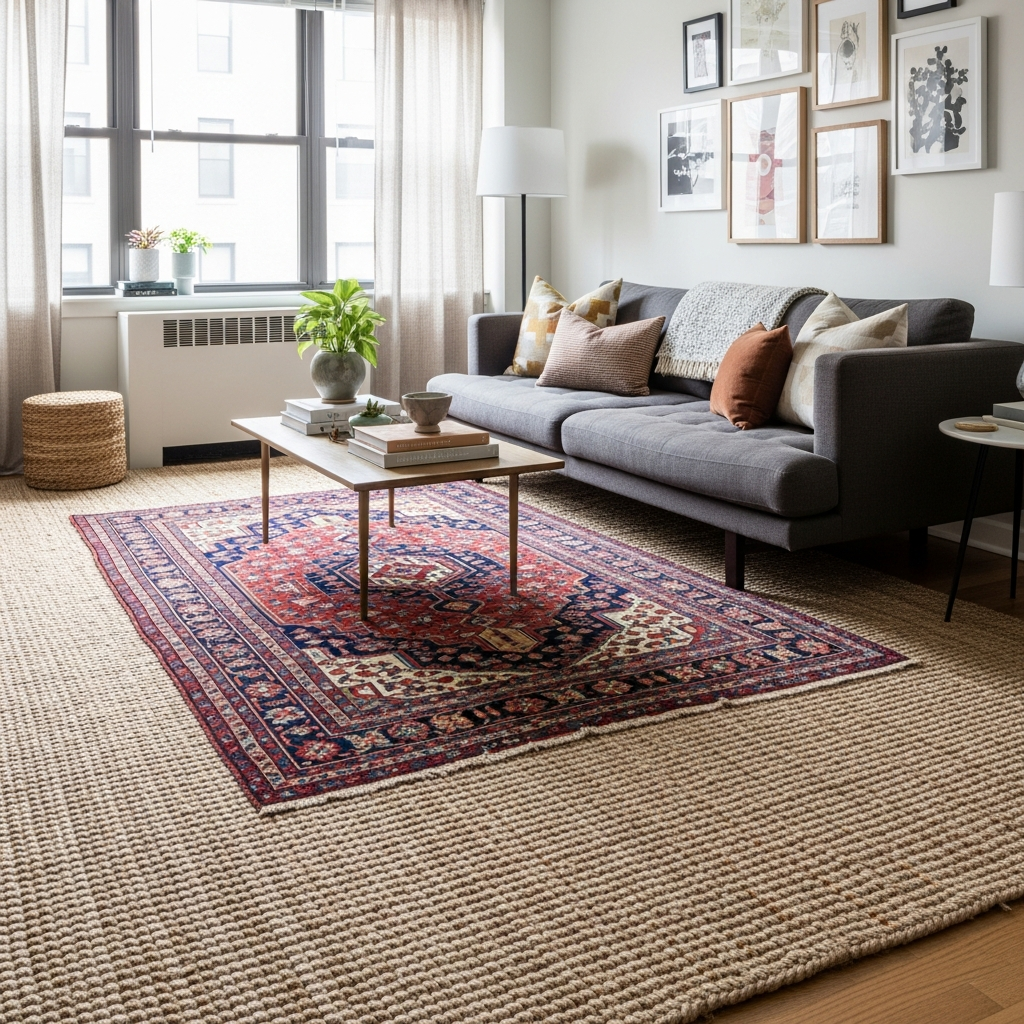To add depth and warmth to your apartment living room, consider layering rugs. Start with a large, neutral jute or sisal rug as a base to define the seating area, then place a smaller, plush Persian or vintage rug on top. This technique introduces multiple textures and patterns, creating a foundation that feels intentionally curated rather than accidental.