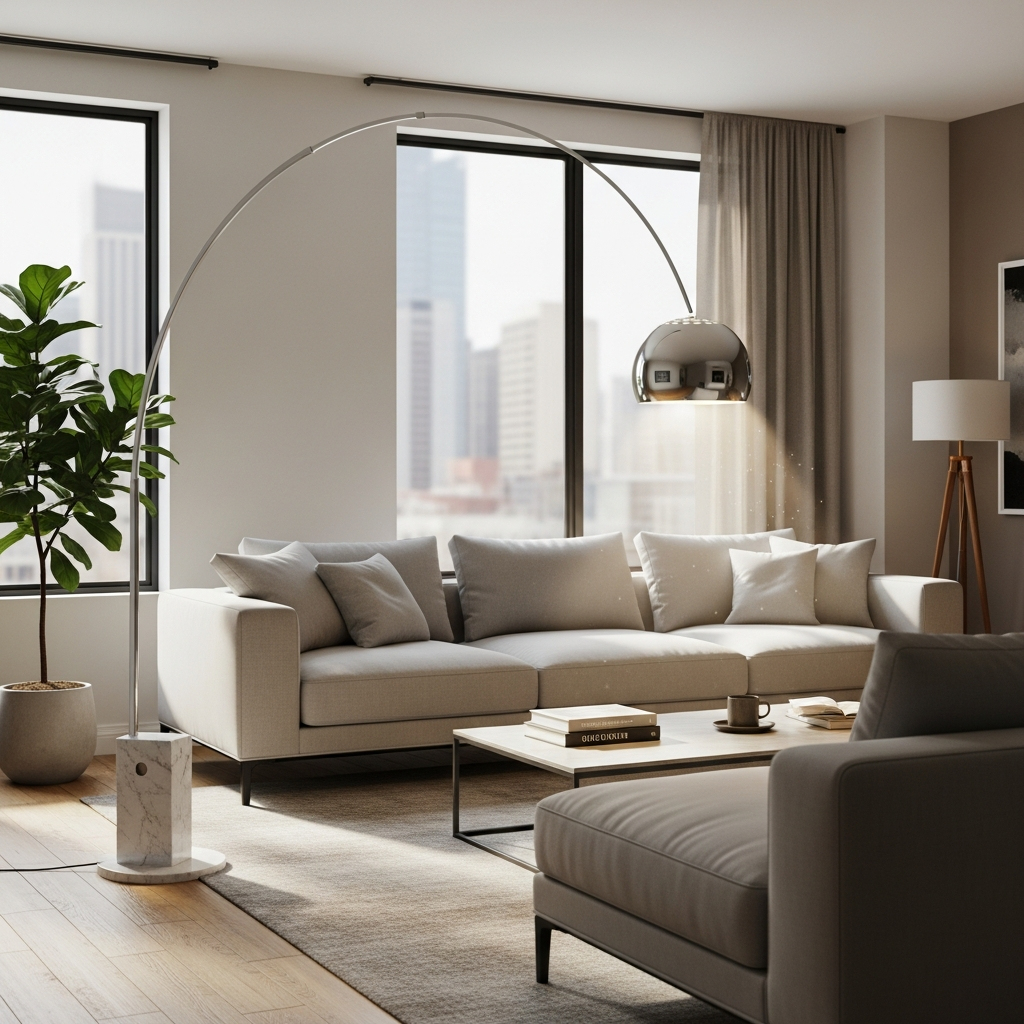 An oversized arc floor lamp provides both functional task lighting and a dramatic design element. Positioning a large lamp over a reading nook or a sectional sofa creates a sense of scale and architectural interest that is often missing in standard apartment rentals.