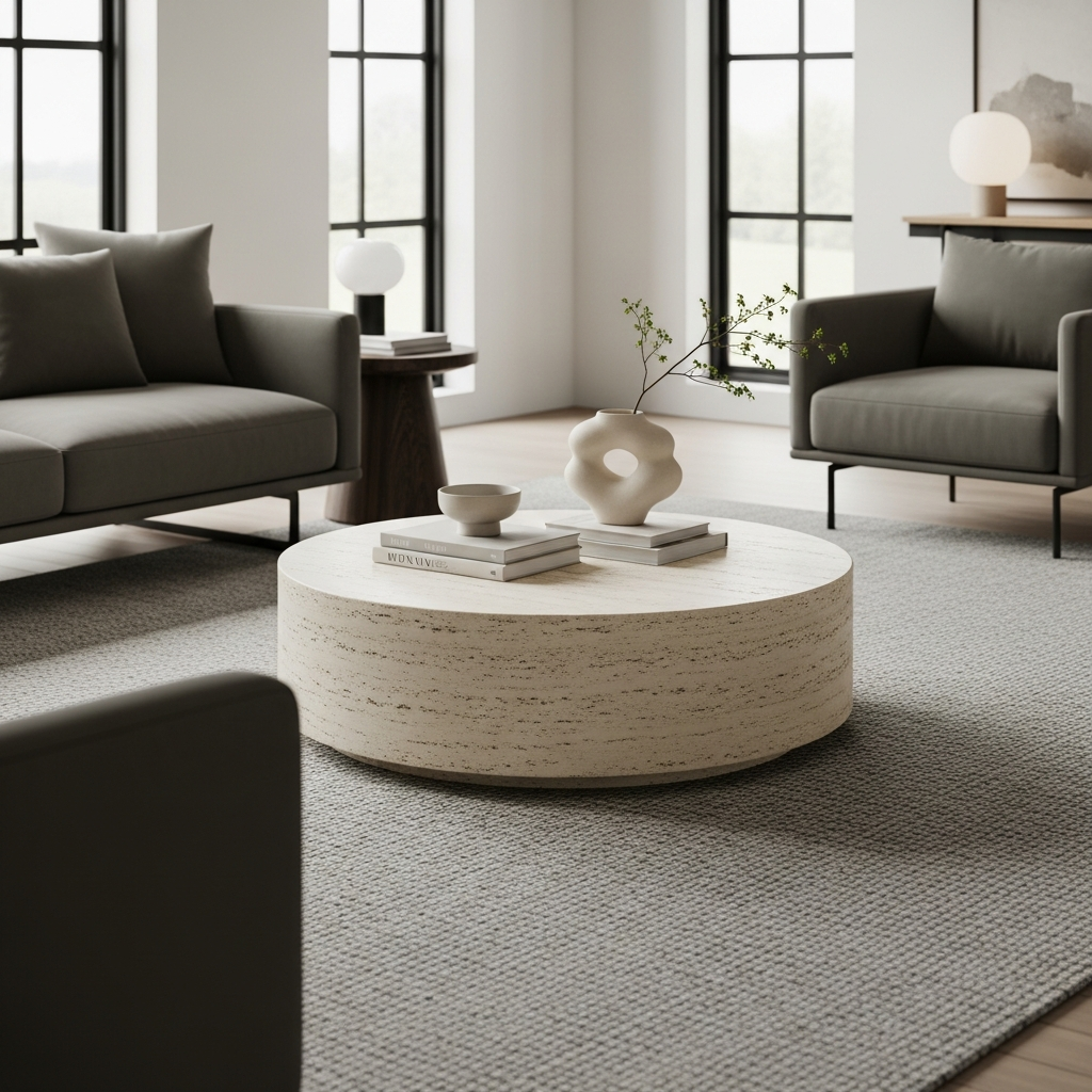 Move away from traditional rectangular coffee tables and choose something with a sculptural form. A round stone table or a geometric wooden design can break up the straight lines often found in apartment architecture, adding a sophisticated edge to the seating area.