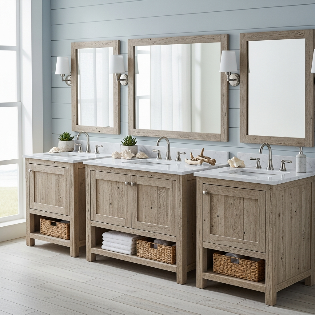 A mirror framed with genuine driftwood or a carefully crafted imitation instantly becomes a focal point. The irregular shapes and weathered textures of driftwood bring an artistic, natural element to the wall. Each piece is unique, adding character and a story to your coastal bathroom.