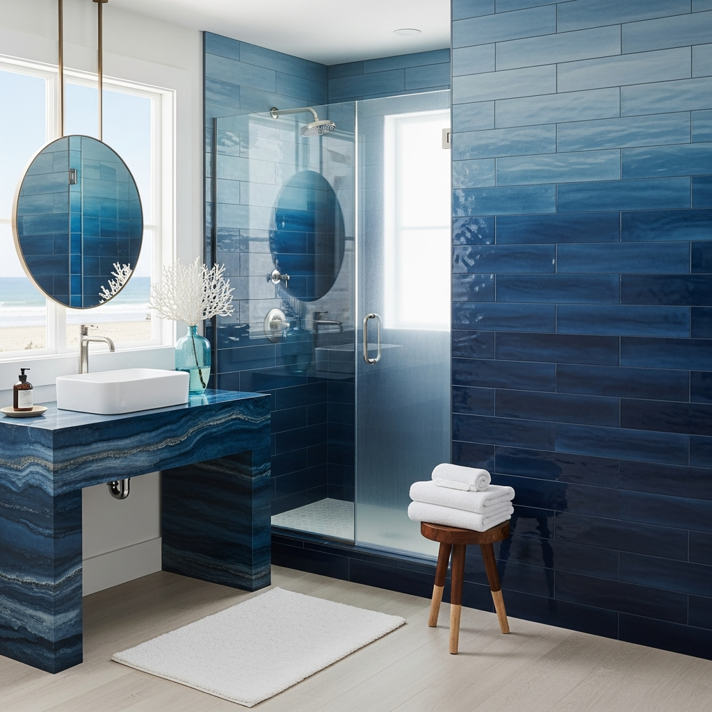 Introduce blues that echo the sea’s depths. From vibrant aquamarines to rich navy, these hues can be used as accents or as a dominant color. A deep blue vanity, for instance, offers a sophisticated contrast to lighter walls, grounding the design with a sense of the vast ocean.