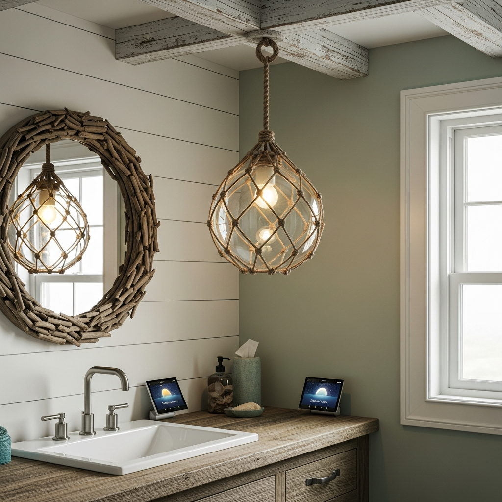 Illuminate your bathroom with unique lighting fixtures that evoke maritime charm. Pendants or sconces designed to resemble glass fishing buoys, with their distinctive glass and rope or metal cages, cast a warm, ambient light. These fixtures are not only functional but also serve as intriguing decorative pieces.