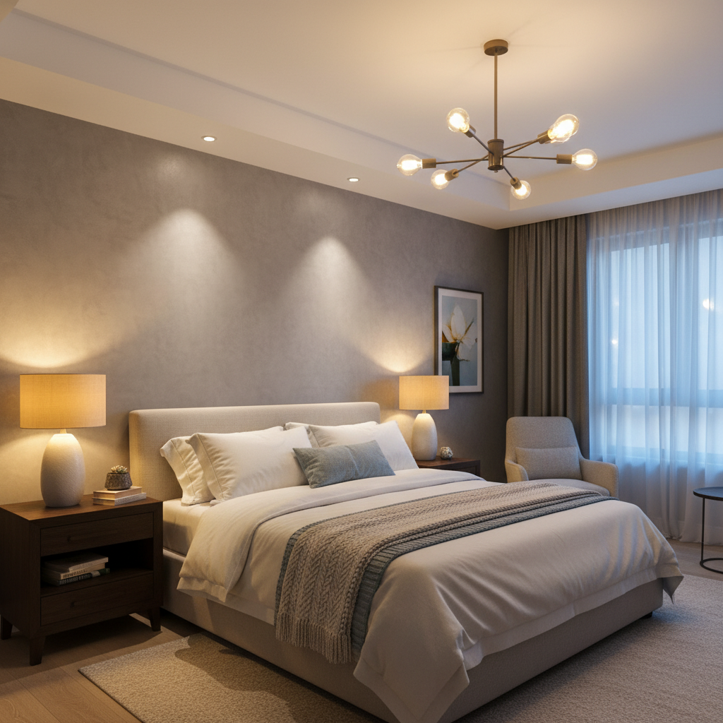 Combine multiple light sources—an overhead fixture, bedside lamps, and a floor lamp—to create flexible ambiance. Dimmers allow you to adjust brightness for different moods. The result is a versatile, cozy, and inviting atmosphere.