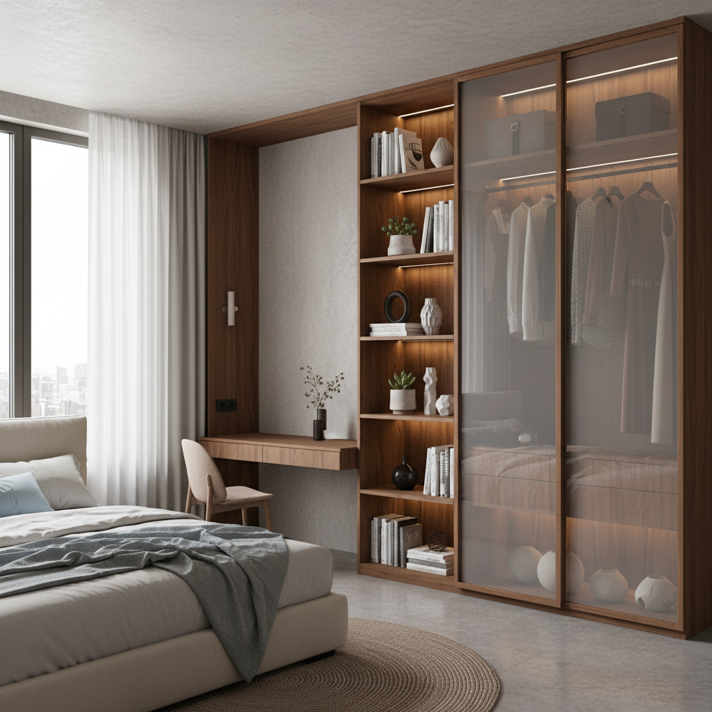 Custom built-ins maximize space, offering seamless storage for clothes, books, and decorative items. They provide a sleek, integrated look that enhances both style and organization. The mood is tidy, efficient, and sophisticated.