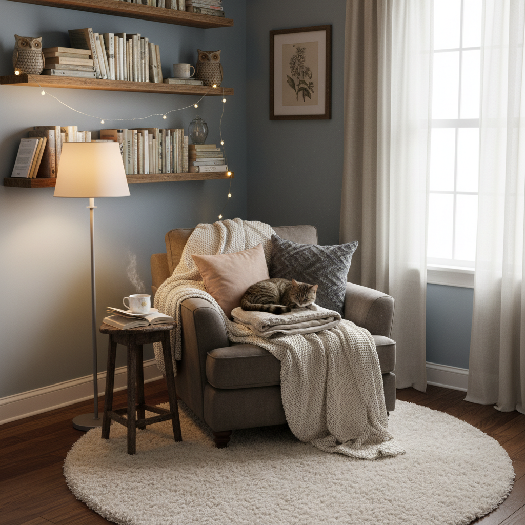 Dedicate a corner of your bedroom to a comfortable reading nook. A plush armchair, a soft throw, a good reading lamp, and a small bookshelf create an inviting escape. The mood is peaceful, intellectual, and relaxing.