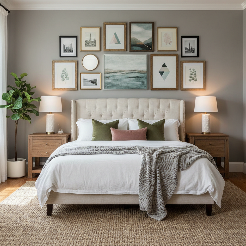 Create a personalized gallery wall above your bed or dresser with a mix of art prints, photographs, and decorative mirrors. This adds visual interest and tells a unique story. The mood is personal, artistic, and engaging.