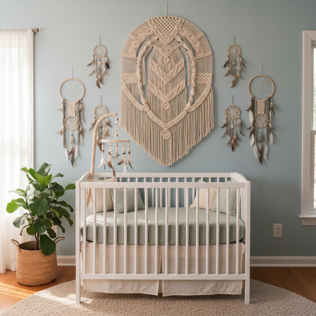 Macrame pieces are quintessential boho decor, adding incredible texture and visual interest to nursery walls. Choose large, intricate macrame hangings to serve as a focal point above the crib or changing table. Complement these with smaller, delicate dreamcatchers, believed to filter out bad dreams, creating a whimsical and protective atmosphere. The knots and patterns of macrame introduce a handcrafted, artistic touch, enhancing the room’s free-spirited vibe.