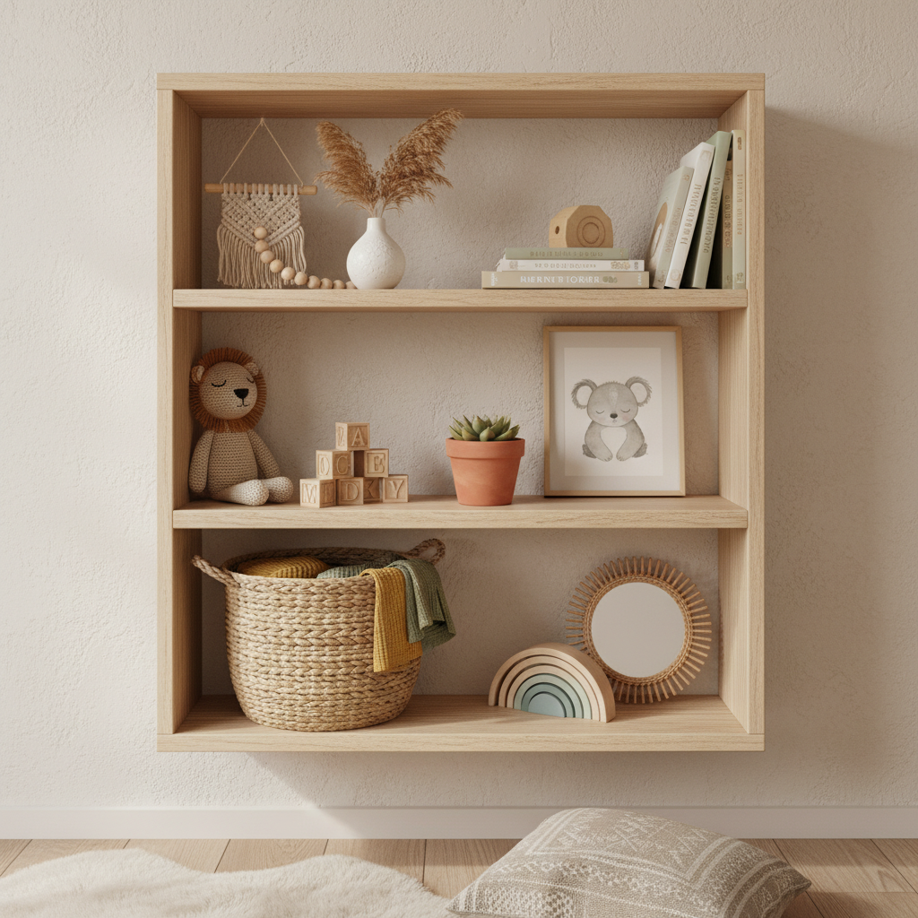 Open shelving is both practical and decorative. Install floating wooden shelves or a rustic freestanding bookcase. Use them to display a carefully curated collection of items—tiny potted plants, wooden toys, framed prints, small baskets, and a few favorite baby books. This allows for easy access to essentials while showcasing charming decor that enhances the boho aesthetic.