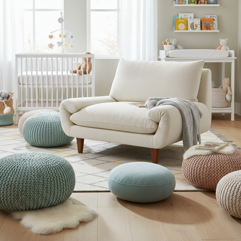 A relaxed, inviting seating area is essential for feeding, cuddling, and reading. Consider a comfortable, low-slung armchair or a soft, plush pouf. Supplement this with an assortment of floor cushions in various sizes, textures, and patterns. These create a cozy, informal spot for both parents and eventually, the child, to relax and play close to the ground, embracing the laid-back ethos of boho style.