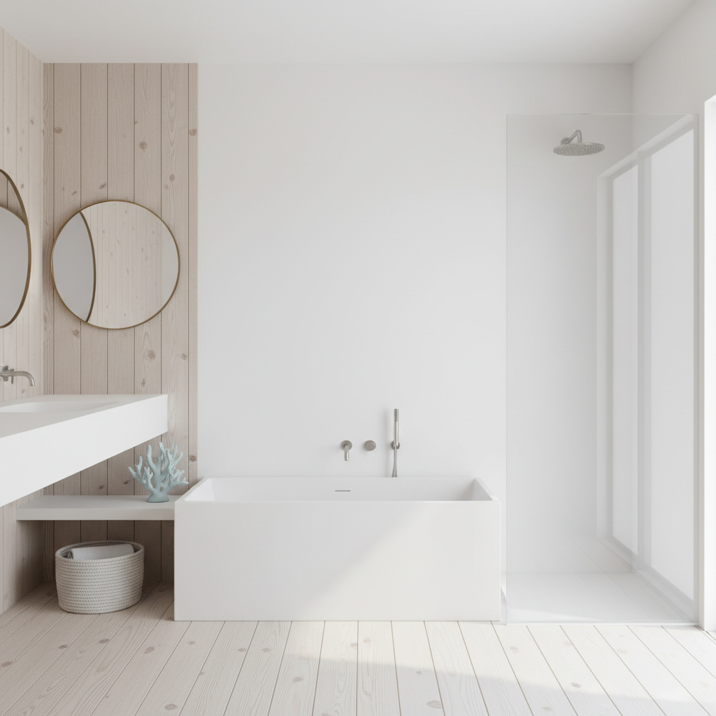 For a serene and uncluttered sanctuary, embrace a minimalist coastal Zen approach. Focus on clean lines, crisp white walls, light-colored wood (like bamboo or blonde maple), and very few, carefully chosen accents. A simple white vanity, a frameless mirror, and perhaps a single large piece of driftwood or a minimalist seascape print. The color palette is primarily white and natural wood tones, with only subtle hints of pale blue or green. This style emphasizes calm, clarity, and the peaceful purity of the ocean, creating a truly restorative space.