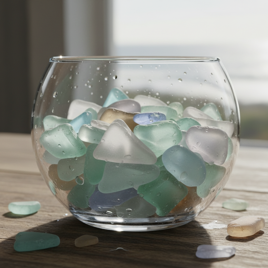 Bring the treasure of the tide into your bathroom with sea glass accents. These tumbled, frosted pieces of glass, smoothed by the ocean, come in beautiful shades of blue, green, and white. Arrange a collection in a clear glass bowl on your vanity, use them as decorative fillers in a clear vase, or even find a custom mosaic using sea glass. Their soft, muted colors and unique textures add an authentic, delicate touch of beach-found beauty. The mood created is one of gentle nostalgia and natural elegance.